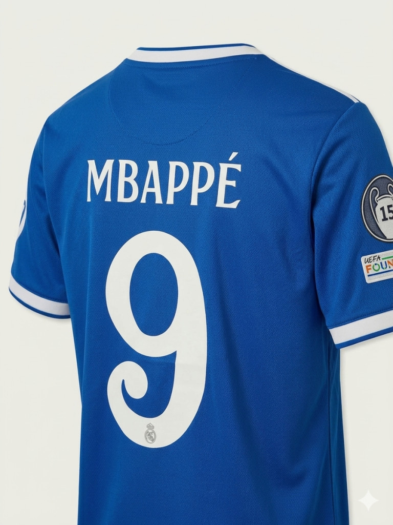 - Číslo 9 Mbappé: Potlačené číslo a meno, ktoré reprezentuje hviezdneho hráča Realu Madrid