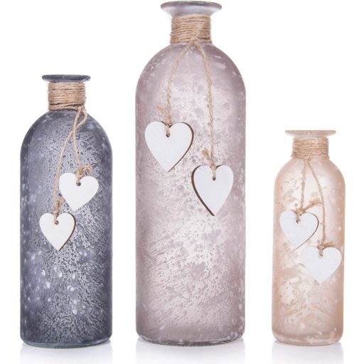 Használhatja őket virágokkal megtöltve vagy önmagukban is, mint dekoratív elemeket. A szizál kötél és a fa szívek természetes meleget kölcsönöznek a szürke üvegnek, így a vázák üres állapotban is figyelemreméltó dísztárgyak.