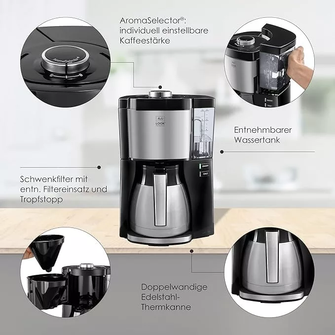 A Melitta Aroma Selector Look V Perfection egy prémium szűrőkávé-gép, amely ötvözi a klasszikus kávékészítés művészetét a modern technológiával. Ez a készülék kifejezetten azoknak készült, akik értékelik a tökéletes kávé ízét és a hosszú ideig meleg italok élvezetét. A termikus kancsó biztosítja, hogy a kávé órákig megtartja az ideális hőmérsékletét, míg az AromaSelector funkció lehetővé teszi az egyéni ízpreferenciák szerinti beállítást.