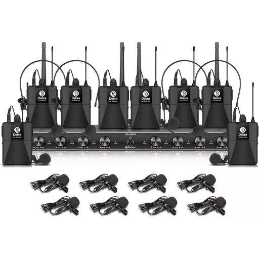 D Debra Audio AU800 Pro UHF 8 Csatornás Vezeték Nélküli Mikrofon Rendszer, 8 Testmikrofonnal, Fém Vevőegységgel - Karaoke, Rendezvény, Egyhá