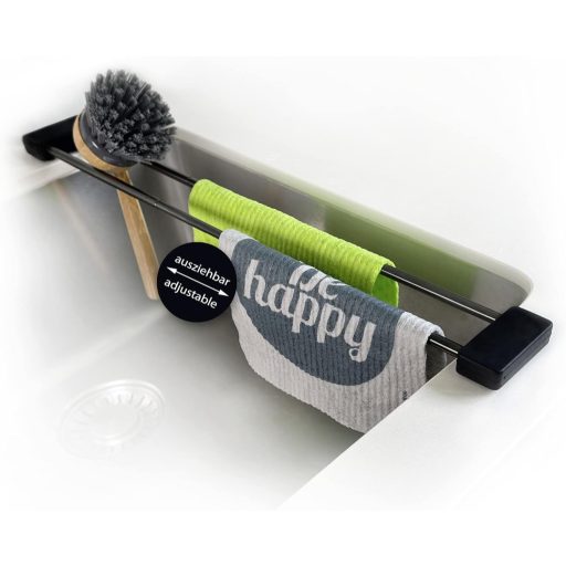 A Sanni Shoo mosogatórongy tartó teleszkópos kialakításának köszönhetően szinte bármilyen típusú és méretű mosogatóval kompatibilis. A 33 cm-es alapméret akár 56,5 cm-ig kihúzható, így tökéletesen illeszkedik a különböző méretű mosogatókhoz. A puha szilikon végeknek köszönhetően nem karcolja meg a mosogató felületét, legyen az rozsdamentes acél, kerámia, kompozit vagy gránit.