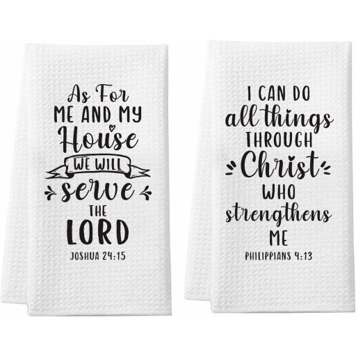 A csomag két különböző, gondosan válogatott bibliai idézettel ellátott törlőkendőt tartalmaz: "Mindenre van erőm Krisztusban, aki megerősít engem" (Filippi 4:13) és "Én és az én házam népe az Urat szolgáljuk" (Józsué 24:15). Ezek az időtlen üzenetek nemcsak a konyhát díszítik, hanem folyamatos emlékeztetőül szolgálnak a hit fontosságára a mindennapokban.