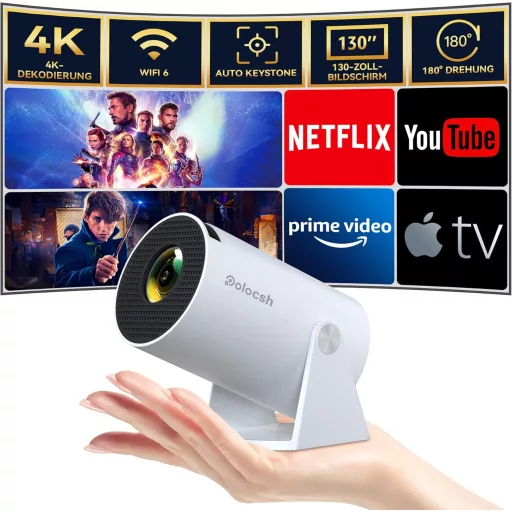 Polocsh Mini Projektor WiFi 6 és BT 5.2 - 720P Full HD, Automata Keystone Korrekció, 180° Forgatható, 130" Képméret, Android 11.0 - Telefon/