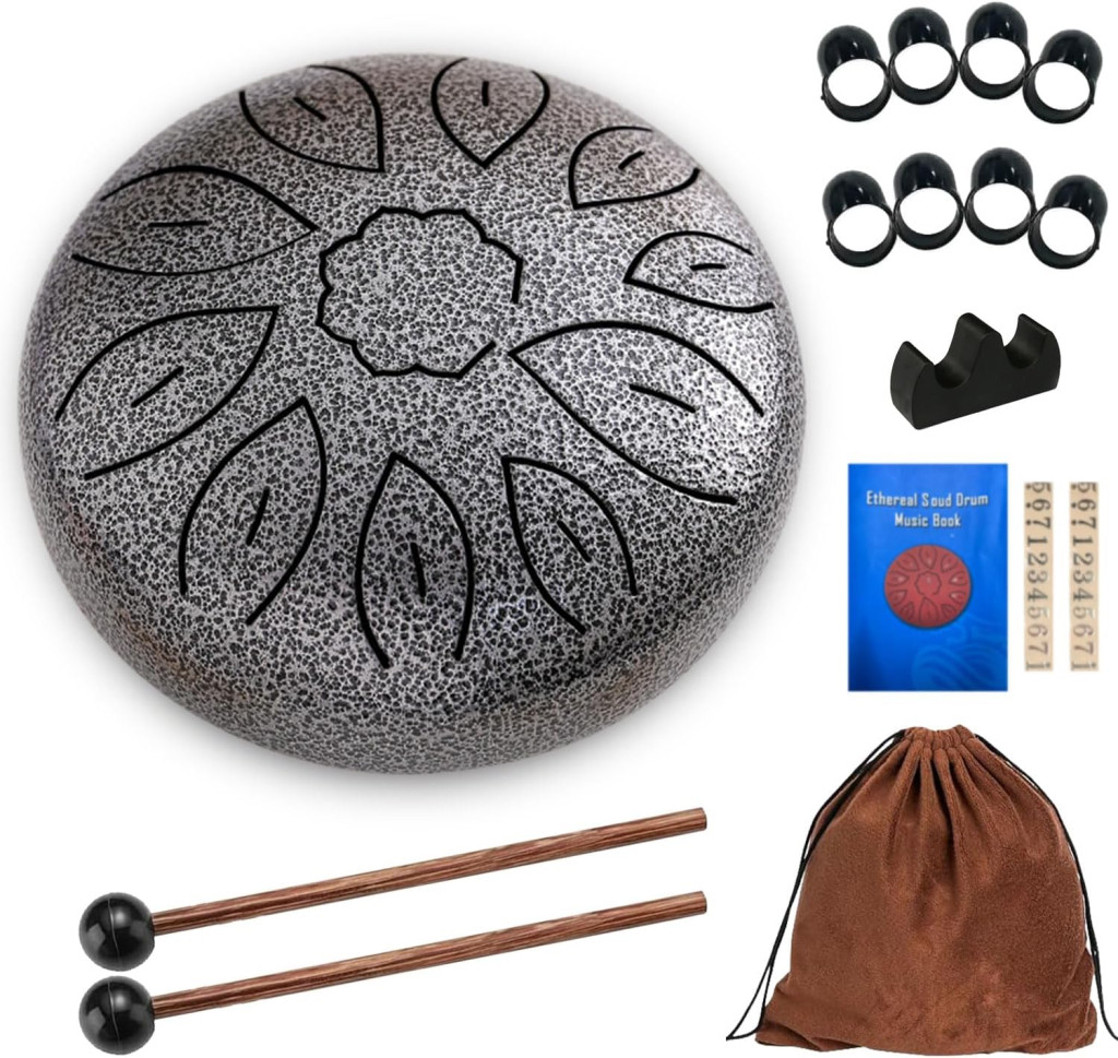 A Tongue Drum egy varázslatos hangszer, amely a lélek hangjaként ismert. Ez a 6 hüvelyk méretű, 11 hangos acél nyelvdoboz a legmagasabb minőségű anyagokból készült, hogy tiszta, éteri és meditációs hangokat produkáljon. Amikor az esőcseppek vagy a dobverő érintik a felületét, minden hang egy spirituális rezonanciát hoz létre, amely belső békét és nyugalmat teremt.