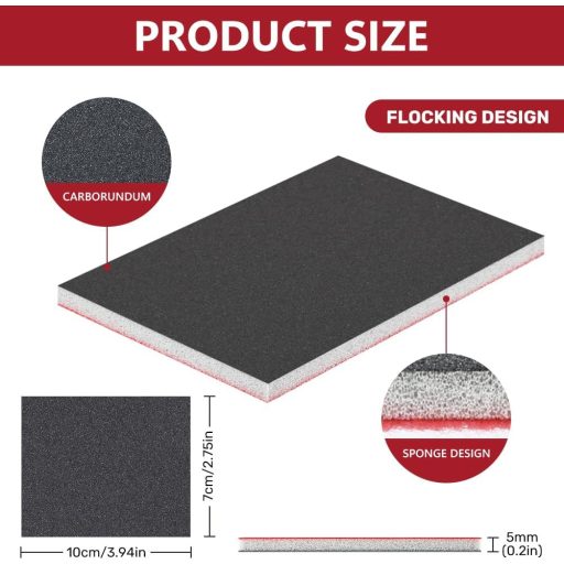 A csiszolószivacsok mérete (10 x 7 cm, 5 mm vastagság) ideális a mindennapi használathoz, és szükség esetén könnyen méretre vághatók a speciális munkákhoz. A rugalmas kialakítás lehetővé teszi, hogy a szivacsok alkalmazkodjanak a különböző formákhoz és kontúrokhoz, így olyan helyeken is hatékonyan használhatók, ahol a hagyományos csiszolópapír nem működik megfelelően.