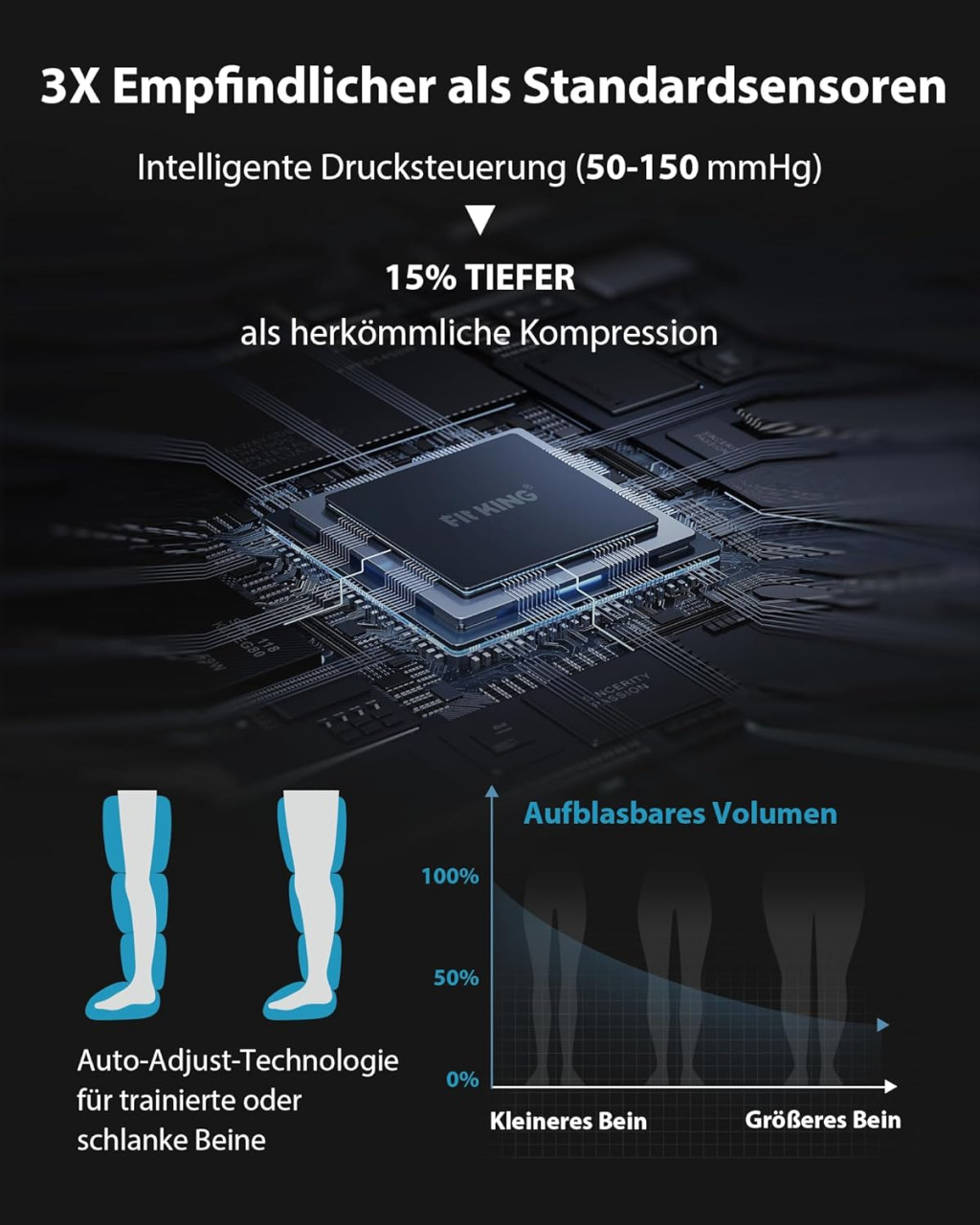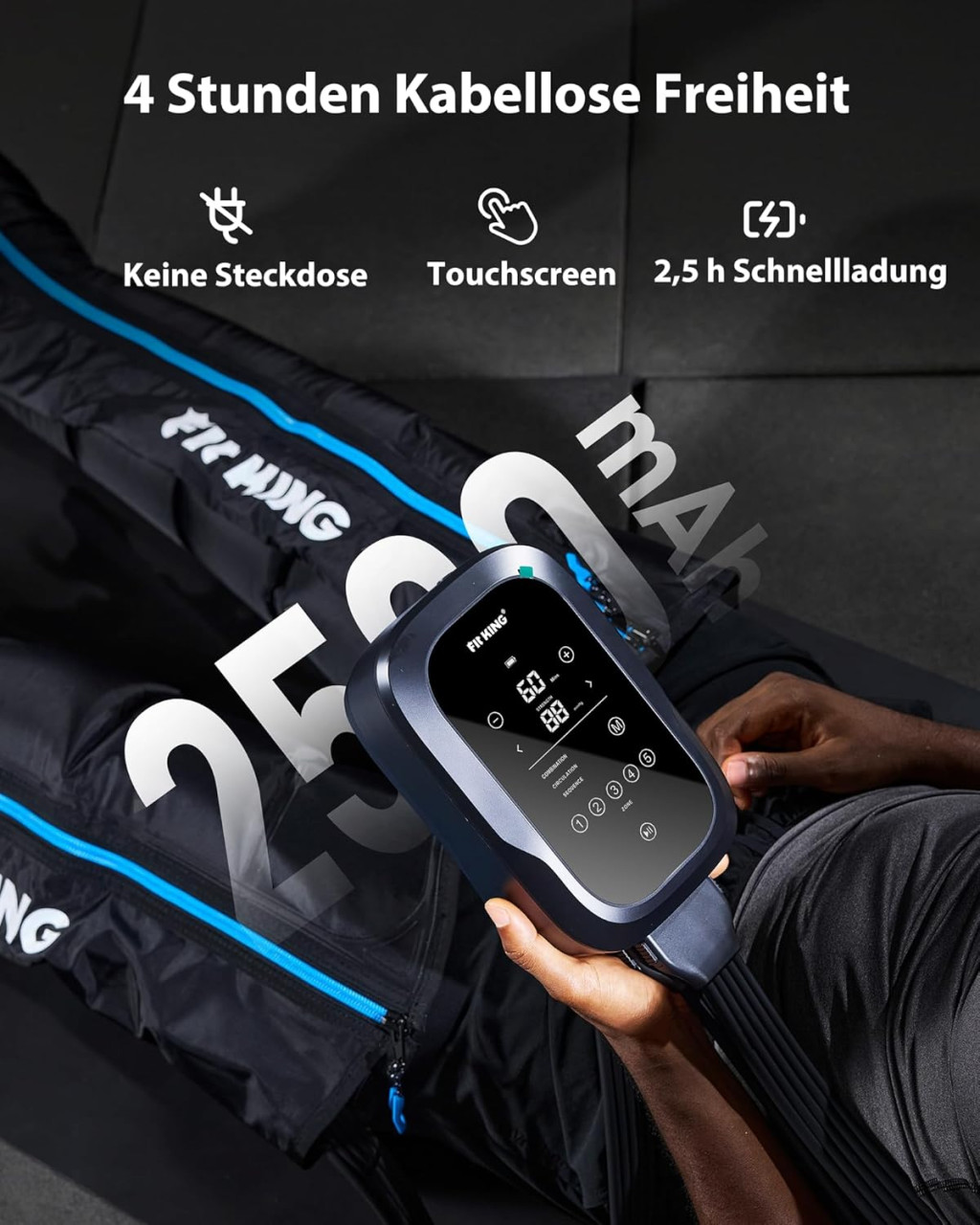 A FIT KING Wireless lábmasszírozó kompressziós csizmák egy professzionális szintű eszköz, amely tudományosan bizonyított módszereket alkalmaz a lábak és a vádli regenerációjához. A 360° dinamikus légnyomás, a 11 intenzitási szint és a 3 masszázsprogram kombinációja lehetővé teszi a személyre szabott kezelést minden felhasználó számára. Az eszköz ideális sportolók, irodai dolgozók és bárki számára, aki lábfájdalomban vagy rossz vérkeringésben szenved.