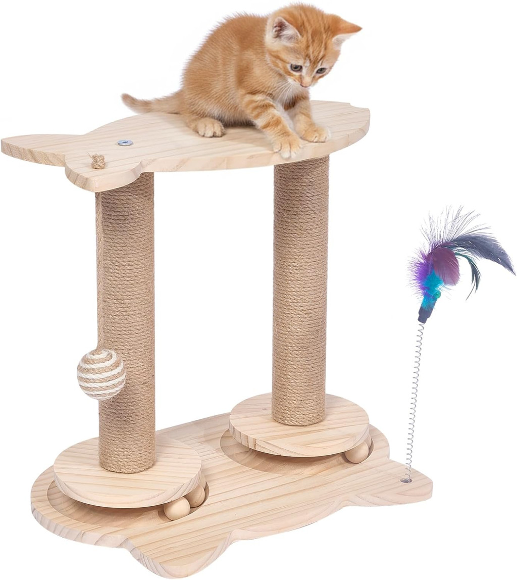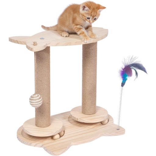 A fa alapanyag és a természetes szizál burkolat biztosítja, hogy macskája biztonságosan és hatékonyan tudja élesíteni karmait. Az interaktív elemek, mint a tollak és a függő labdák, garantálják, hogy kedvence soha nem fog unatkozni.