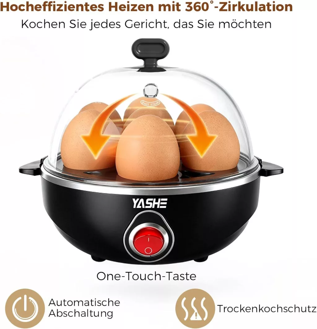 A YASHE elektromos tojásfőző egy modern konyhai segédeszköz, amely teljesen megváltoztatja a tojásfőzés módját. Ez az elegáns és kompakt készülék 7 tojás egyidejű főzésére képes, legyen szó puha, közepes vagy kemény főtt tojásokról. Az egyszerű kezelés és a beépített biztonsági funkciók miatt ideális választás minden háztartásban, a diákszobáktól a családi konyhákig.