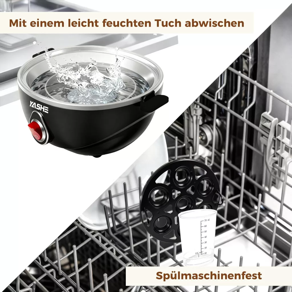 A YASHE tojásfőző könnyen tisztítható és hosszú élettartamú. Az összes alkatrész eltávolítható és mosható. A fűtőlapot rendszeresen tisztítsd meg a vízkőlerakódások eltávolítása érdekében. Használj puha szövettel és enyhén meleg vízzel. Soha ne merítsd vízbe az elektromos alapegységet. A készülék száraz helyen tárolható, és nem foglal sok helyet a konyhában.