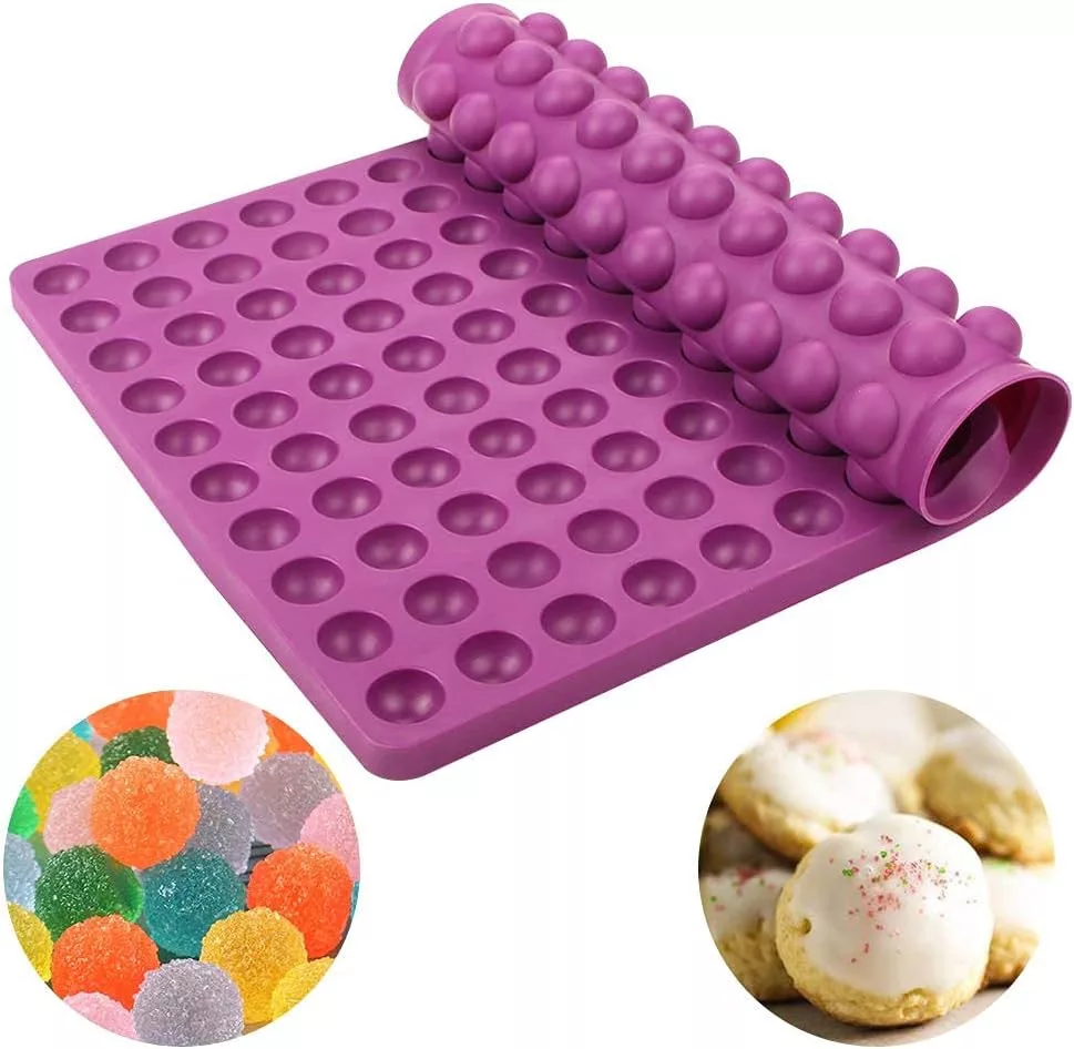 Egy sütőforma 140 darab 2 cm átmérőjű félgömb alakú üreggel, amely lehetővé teszi nagy mennyiségű apró édességek egyidejű készítését.