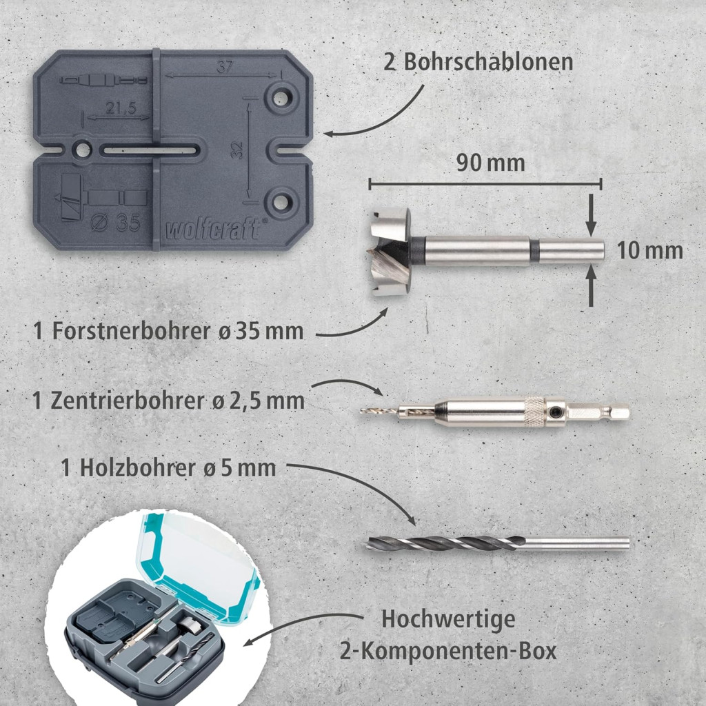 Az 35 mm átmérőjű Forstner fúró ideális a csuklólyukak fúrásához, míg a mellékelt fúrósablonok biztosítják a pontos pozicionálást. A készlet minden szükséges komponenst tartalmaz a kezdetektől a befejezésig.